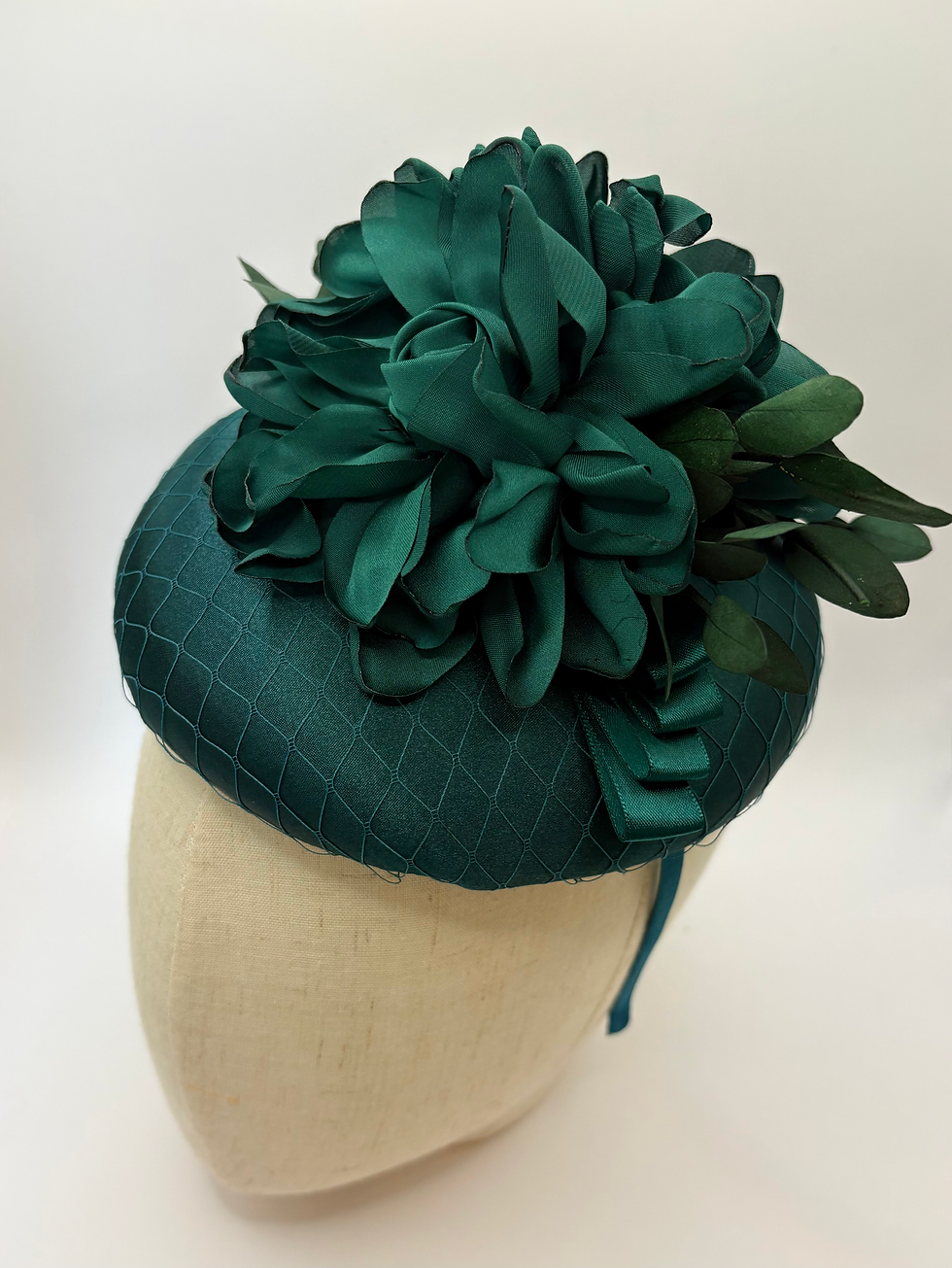 Stunning Forest Olive Green Satin Flower Pillbox Fascinator Hat